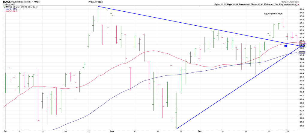 Using MAGS (the Mag7 ETF) as a proxy, the former leaders appear to have entered a downtrend in the final two months of 2025.