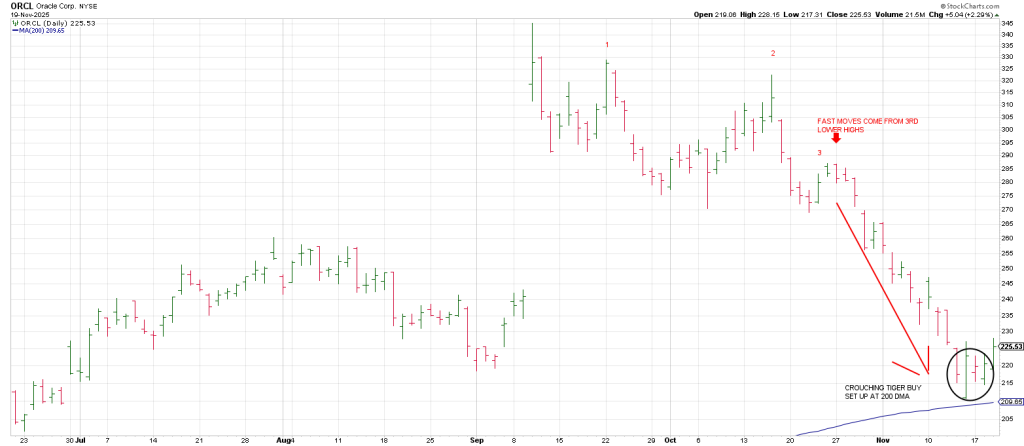 In the case of ORCL the Crouching Tiger played out at the 200 day and + or – the 208 square-out flagged last week.