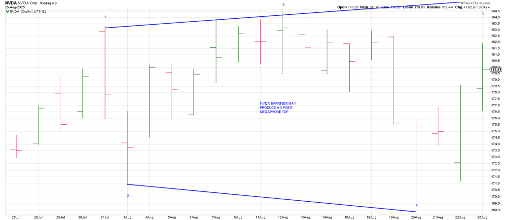 NVDA while flirting with new highs going into earnings may carve out a Megaphone Top after reporting.