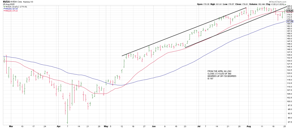 Breakage below the bottom of NVDA’s current triangle could occur at 177 triggering a Triangle Pendulum sell signal…with the 50 DMA looming large below at the 168 region.