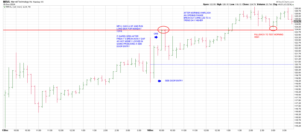A 10 min MRVL shows the gap open followed by a snapback for a Side Door Entry as overnight hot money captured the carry over trade from Friday.