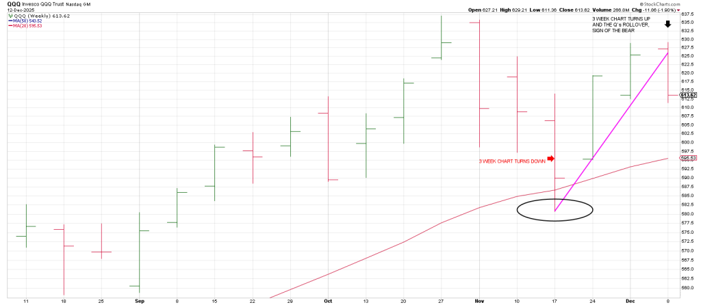 The Q’s turned their 3 Week Chart down right off their all=time high on October 29 testing their 20 week moving average for the first time since the April low.