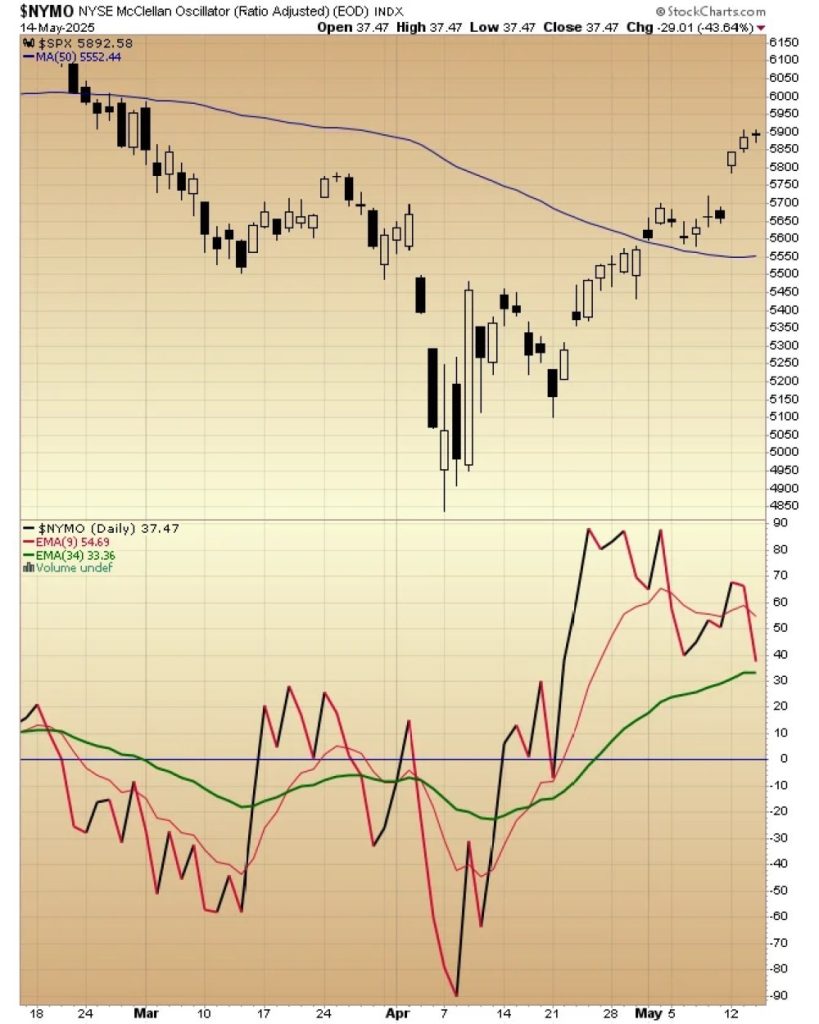 Momentum deteriorated sharply, highlighted by a steep drop in the MYSE McClellan Oscillator below.