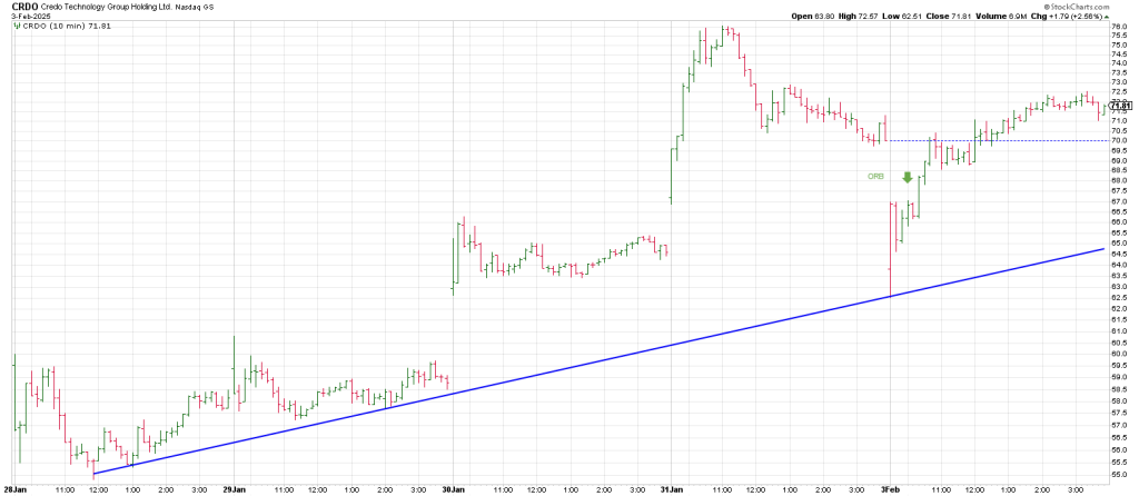Be that as may, the open pretty much defined the morning low and CRDO went on to trigger an Opening Range Breakout at 67.01…a tick over the 10 min opening reversal bar.