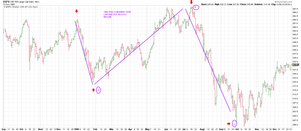 36 years ago was 1990. It was a bearish year.The SPX carved out a large A B C correction throughout the year. It struck a high in January 1990 and dropped 11% that month. It made a nominal new high in June and rolled over dropping 20%.