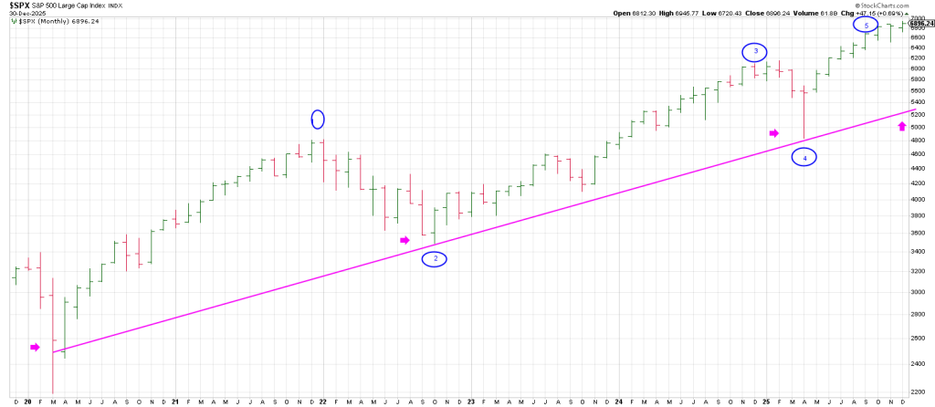 There is a clear 3 point trend line connecting the 2020 low, the 2022 low and the April 2025 low that currently resides at the 5300 region.
