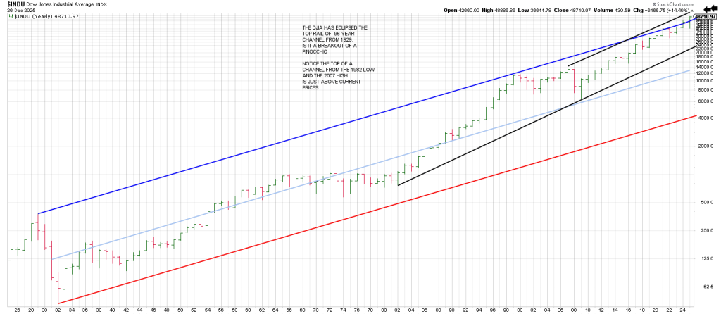 A long term yearly DJIA shows the index has just eclipsed the top rail of a 96 year channel.