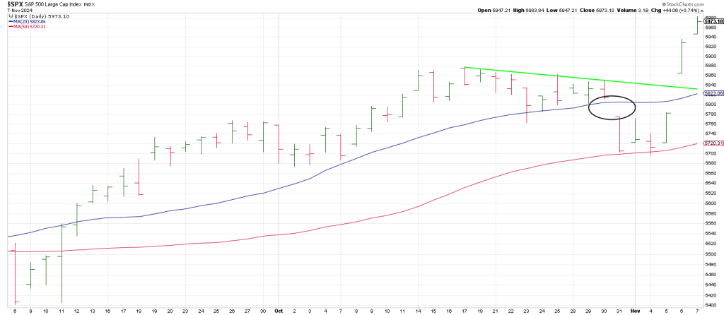 On the next trading day after October 11, on Oct 14th, the SPX struck a high of 5871 before pulling back 170 points until last Thursday, Oct 31st.