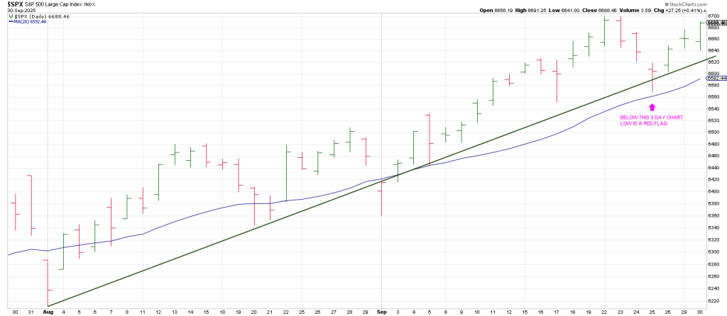 The 3 Day Chart circled low at 6559 on September 25 is the critical point to watch.