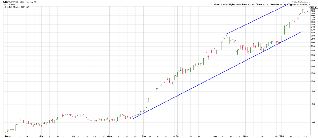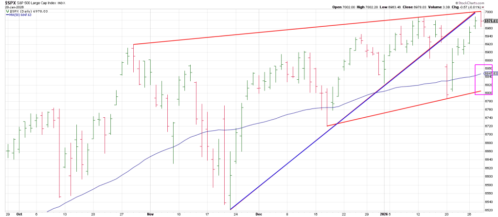 Confirmation of a top will come on breakage below the 50 day moving average in tandem with a drop below a 2 month trend channel.