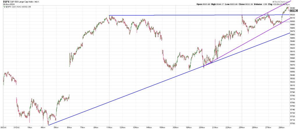 A 10 min SPX for November shows how the 6020 (602) square-out was resistance 3 times in November—until Friday’s holiday-shortened session.