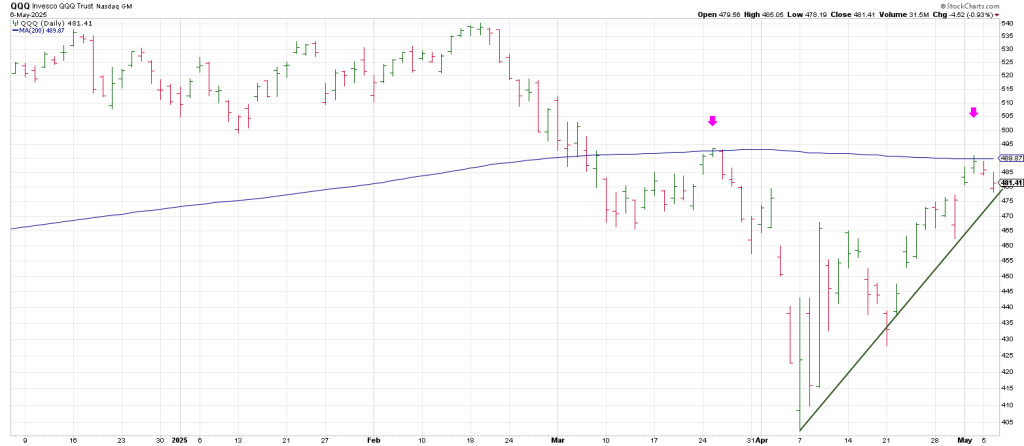 Checking the Q’s shows a second picture perfect test of the declining 200 day moving average for a possible double top.