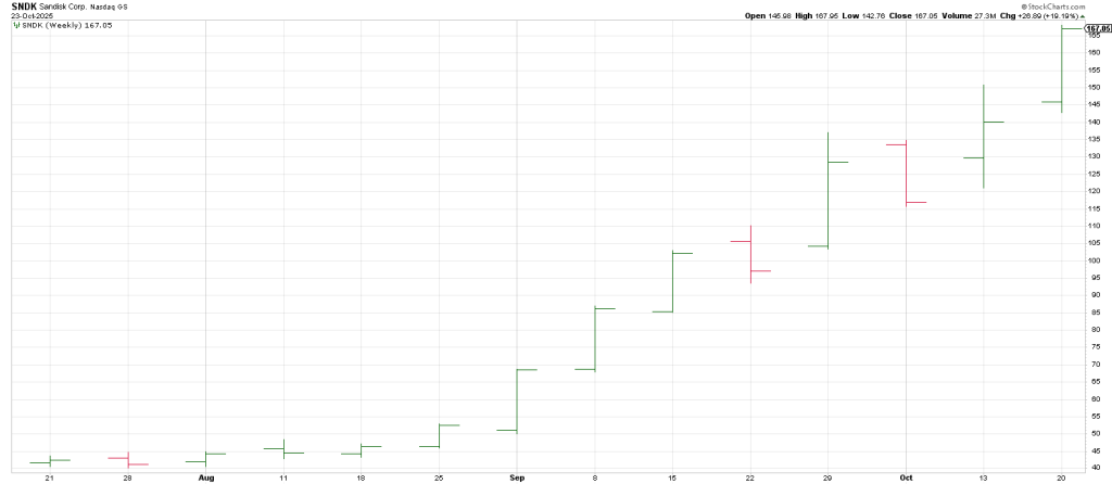 Notice that SNDK hasn’t inhaled since exploding in August. It hasn’t turned its Weekly Swing Chart down since going parabolic.