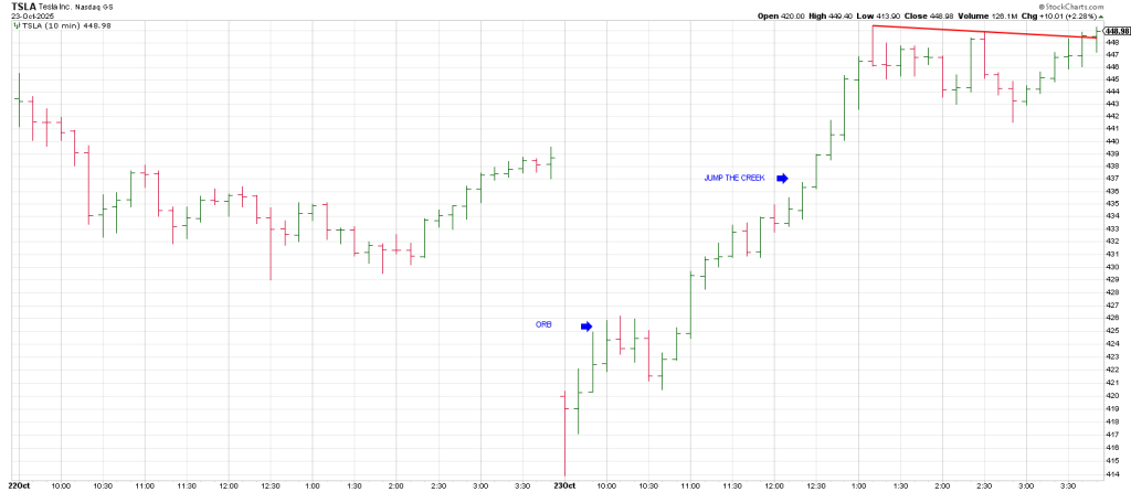 After triggering an up ORB, TSLA pulled back briefly, but exploded when it cleared the ORB at 425.86.