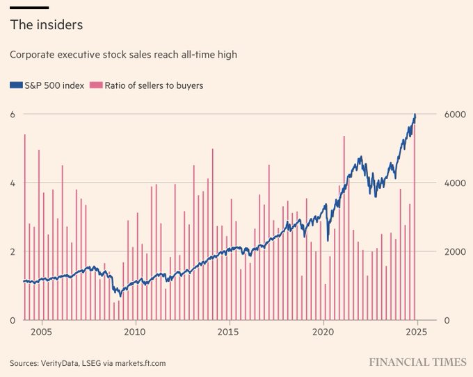 “Record numbers of US executives are selling shares in their companies. The ratio of insider sales-to-insider buys has hit a record high for any quarter in two decades.” Financial Times