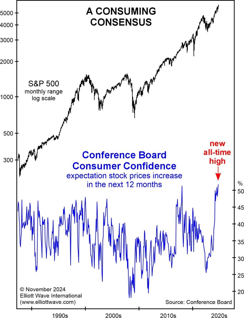 Re 2) A chart of the Conference Board Consumer Confidence survey shows the public’s consensus for a rising stock market has more than doubled in the last two years to an all-time high. In a word, the public is euphoric for stocks.