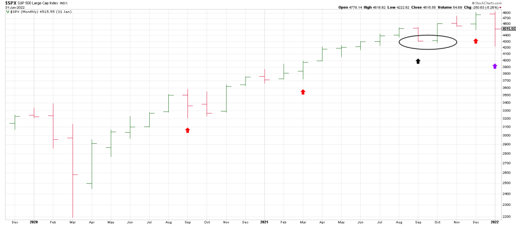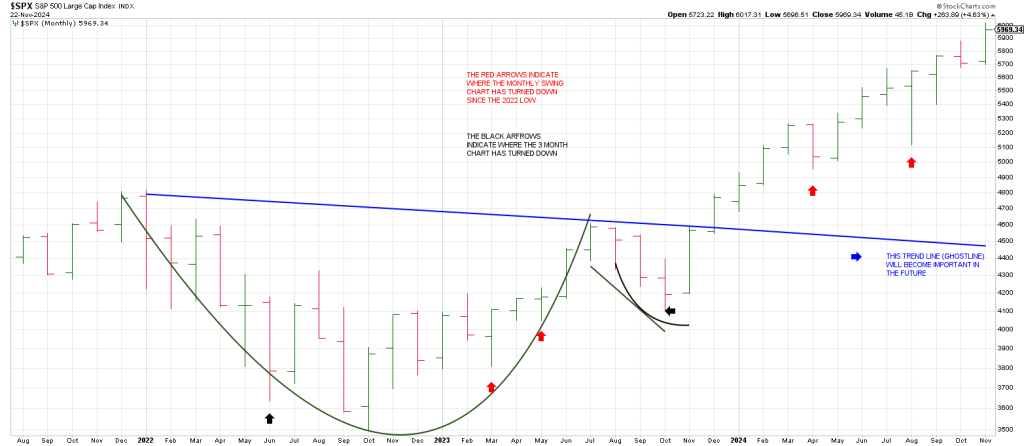 Following the October 2022 low each turndown in the Monthly SPX Swing Chart defined a low (red arrows).