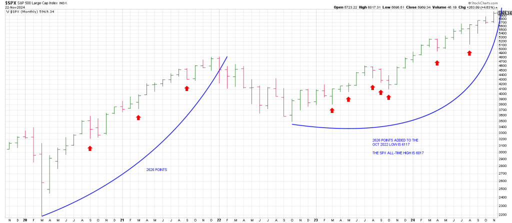 Re 1) The SPX broke out of a monthly Cup and Handle formation in January 2024 triggering a 1200 point, 25% advance this year.