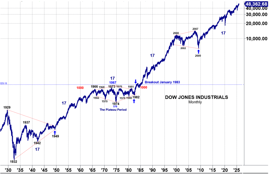 Further note that the lows of 1949, 1982 and 2009 were ‘launch points’ for huge 17u year rallies. (I count from the breakout of the ‘plateau period’ in 1983 because that is where the ‘launch’ began).