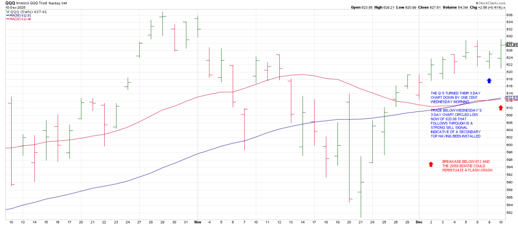 The Q’s turned their 3 Day Chart down by one cent Wednessday morning. Trade below Wednesday’s 3 Day Chart circled low now at 620.99 that follows through is a strong sell signal indicative of a secondary top having been installed.