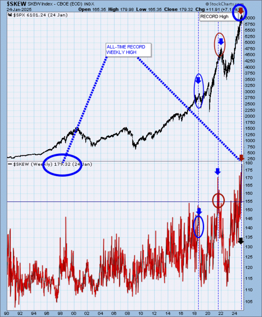 The SKEW index, which measures tail-risk pricing, peaked at significant market tops in late January.