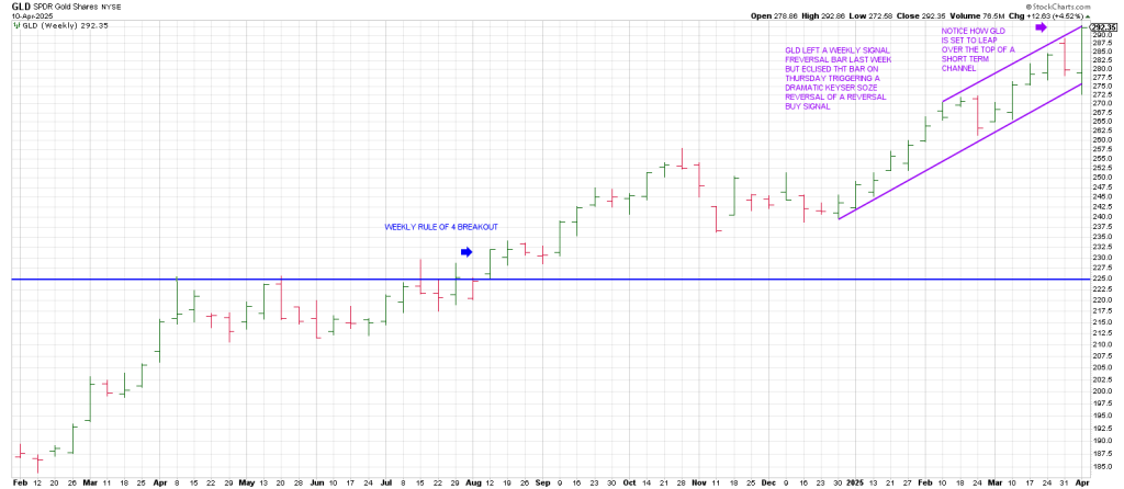 GLD left a weekly signal reversal bar last week but eclipsed that bar yesterday triggering a dramatic Keyser Soze Reversal of a Reversal buy signal.