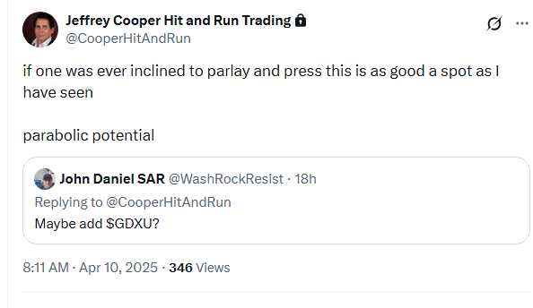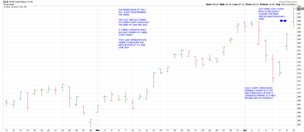 Yesterday GLD turned its 3 Day Chart back up…not because it traced out 3 consecutive higher daily highs…it didn’t, but because it cleared the last circled 3 Day Chart high from April 3rd.