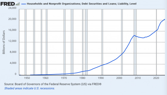 U.S. households have also been accumulating debt at a staggering rate. Total household and nonprofit organization debt did not pass the $2 trillion mark until the mid-1980’s, but now U.S. household and nonprofit organization debt has sur passed the $20 trillion dollar mark. Household debt alone accounts for approximately $18 trillion of this total.