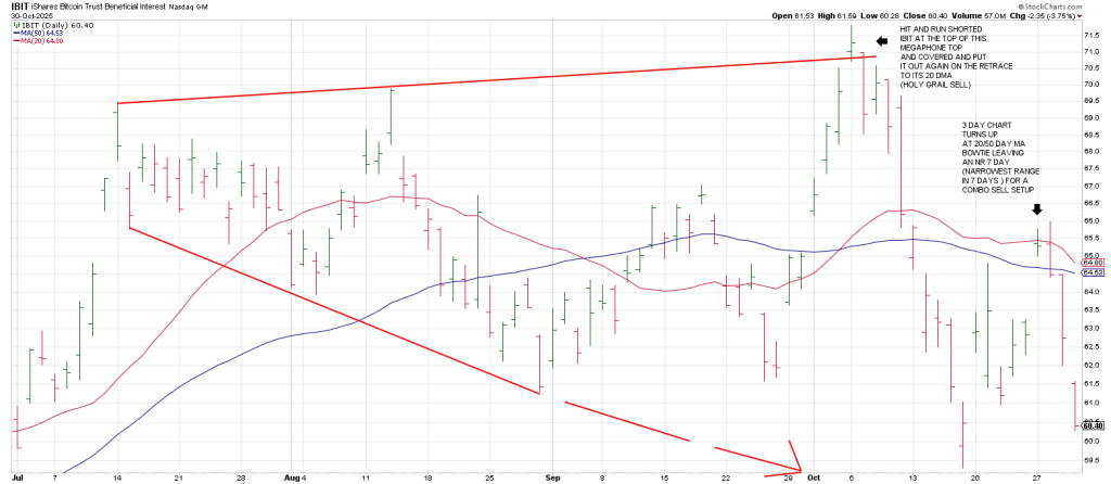 Hit and Run shorted IBIT at the top o this Megaphone Top and covered and put it out again on the retrace to its 20 DMA for a Holy Grail sell signal.