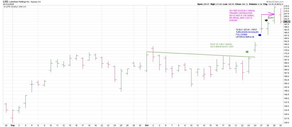 October 29 was Pay Day as LITE triggered another continuation buy signal, a Keyser Soze that triggered on trade above October 27 signal reversal bar.