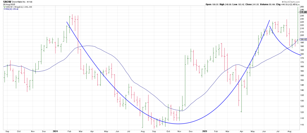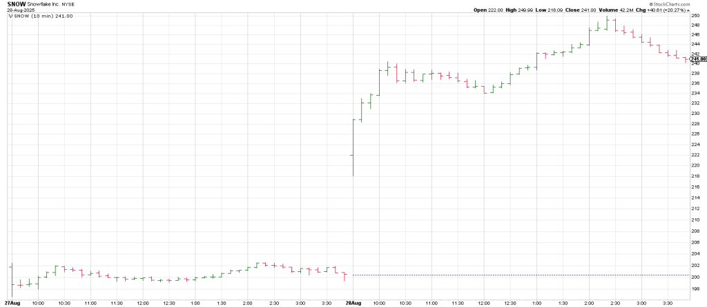 Following earnings, SNOW blasted to 250 before settling at 241.
