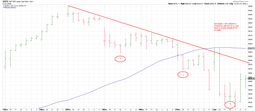 An hourly SPX shows a potential pattern of 3 Drives to a Low.