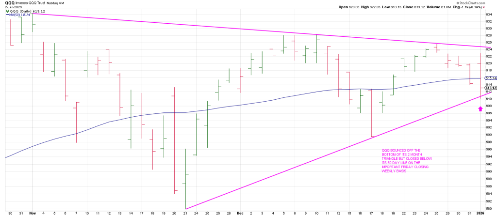 The QQQ also tested the bottom of its triangle; however, it closed below its 50 day moving average on the important Friday weekly closing basis.