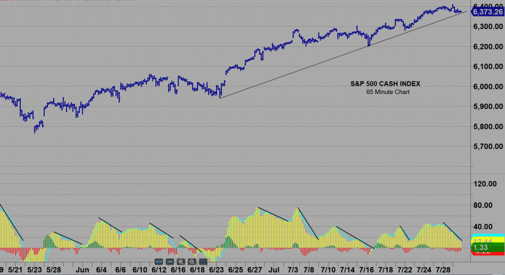 An hourly SPX shows that downside follow thru from Turnaround Tuesday’s KRD will trigger breakage of a 3 point trend line, a Rule of 4 Sell signal.
