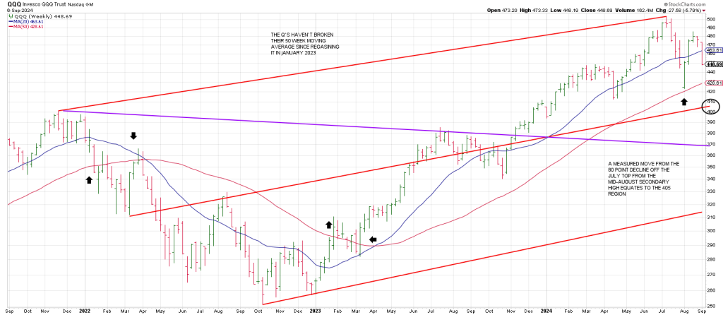 Checking a weekly QQQ shows a mid-channel line at 405 region. From the 503 high a drop to 417 satisfies a 360 degree decline. This also ties to a Measured move from the Wave down from July to August.