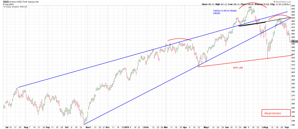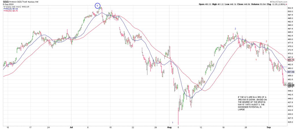 If the Q’s are in a 3rd of a 3rd wave down, then based on the degree of the drop in Wave 1 into August 5th, the downside potential is large.