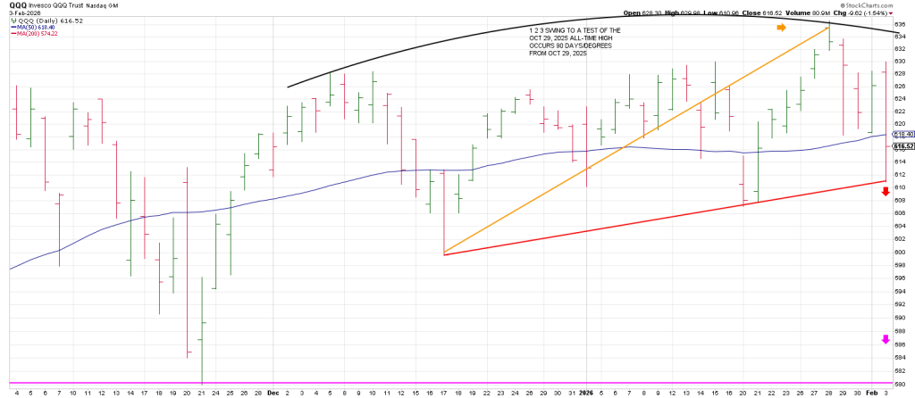 We have a close below the 50 day ma. Remarkably, 90 degrees down from the QQQ January 28 636.60 high is 610.60.