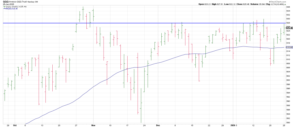 A weekly QQQ shows an Ascending Triangle with three tests of the 20 week moving average and three tops at the 625-630 region.