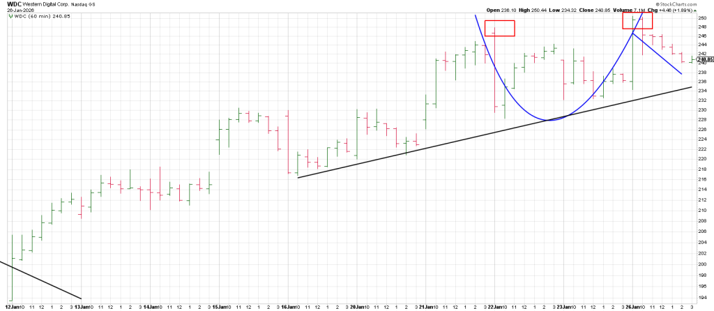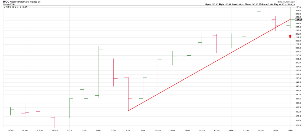 A daily WDC shows it left a Lizard sell signal on Monday—a new 10 day high that tails off closing near the open.