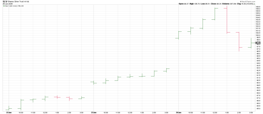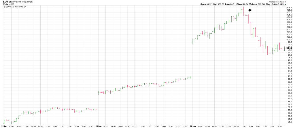 My platform does not provide intraday data for silver, so let’s take a look at SLV to see how Monday’s reversal unfolded.