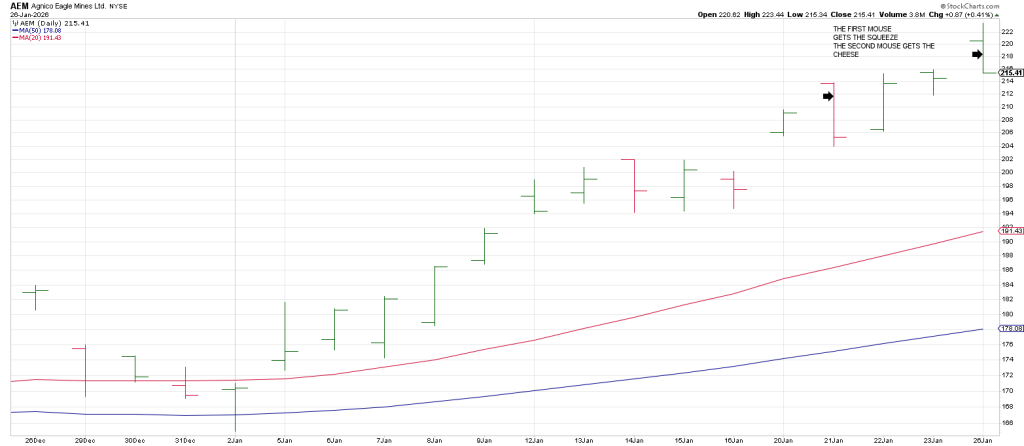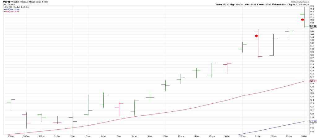 Checking two major miners, AEM and WPM shows that both left Key Reversal Days on January 21.