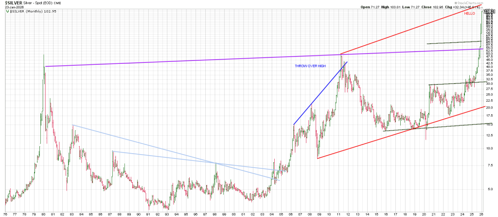 We should an historic chart of silver from the 1970’s with a trend channel connecting the 2009 low and the 2019-2020 lows (red).