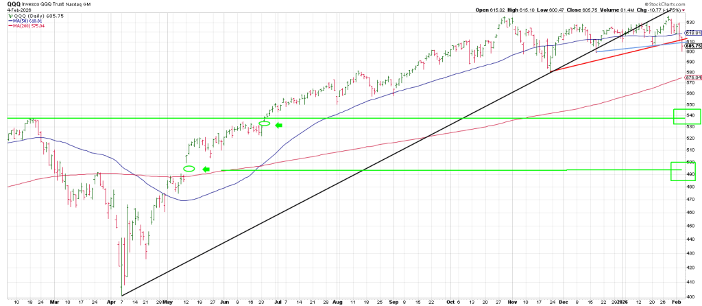 The Q’s triggered a Rule of 4 sell yesterday following a false breakout to a Nicola Tesla high of 636 on January 28th.