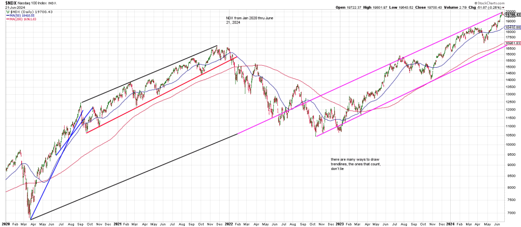 Extending the same black to magenta trend line gives the July 2023 top, the March/April highs and it was just struck again.