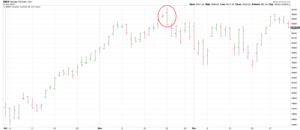 In sum, following a Runaway Move, the NDX left an indecision bar on November 19th 2021. The next trading day, November 22, 2021 the NAZ left a Key Reversal Day. It marked a high that would not be exceeded for 2 years and 3 months.