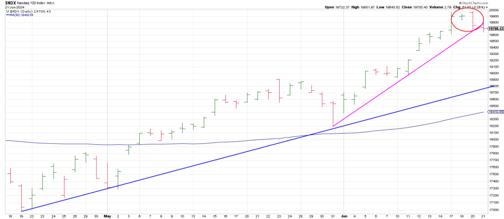 Last week following a torrid run, the NDX left an indecision bar on Wednesday followed by a Key Reversal Day on Thursday.