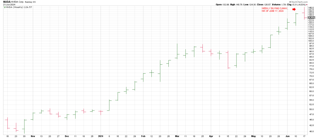 In addition to a Key Reversal Day, this single biggest driver of the market advance also left a weekly Buying Climax last week. It made a new all-time intraday high but closed the week lower, near the bottom of the week’s range.