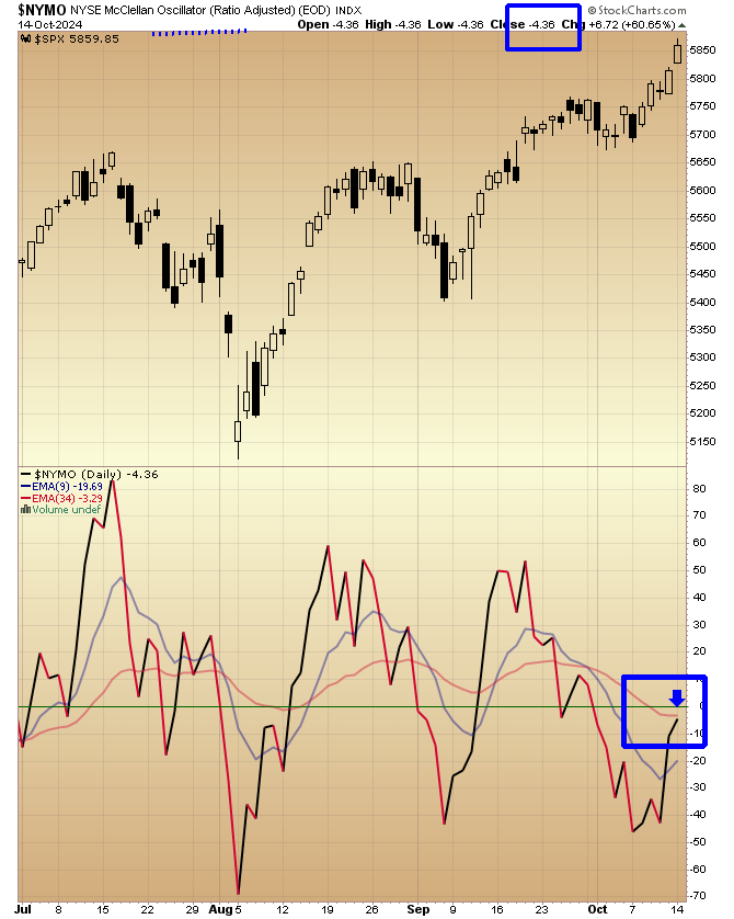 Despite positive breadth of 505 net advancing issues, the McClellan Oscillator remained negative on Monday.