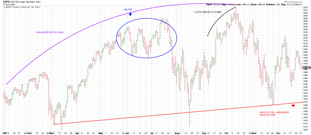 Once the 3 Drive concluded in October ’07, the SPX started to collapse without a sideways stint of distribution