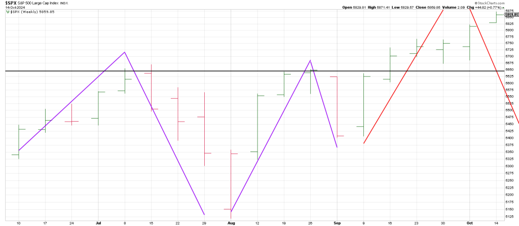 Given the weak McClellan readings currently synchronous with other major tops, downside follow through below the peaks of the ‘M’ around 5650 indicates a major top is on the table.